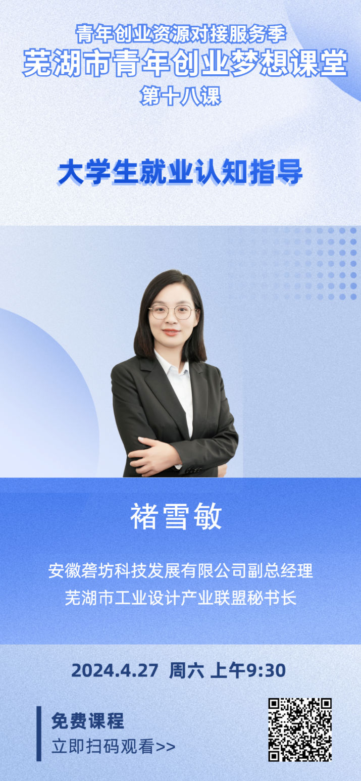 4月27日上午,“源來(lái)好創(chuàng)業(yè)”青年創(chuàng)業(yè)資源對(duì)接服務(wù)季——蕪湖市青年創(chuàng)業(yè)夢(mèng)想課堂第十八課正式播出。本次是由安徽礱坊科技發(fā)展有限公司副總經(jīng)理,蕪湖市工業(yè)設(shè)計(jì)產(chǎn)業(yè)聯(lián)盟秘書(shū)長(zhǎng)褚雪敏帶來(lái)的《大學(xué)生就業(yè)認(rèn)知指導(dǎo)》課程。